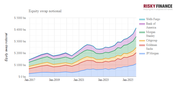 According to Risky Finance analysis of Federal Reserve filings, the equity swap exposures of JP Morgan, Bank of America, Citigroup, Wells Fargo, Goldman Sachs and Morgan Stanley reached $4 trillion at the end of September, led by JP Morgan with $1.1 trillion notional of equity swaps and Goldman with $934 billion.