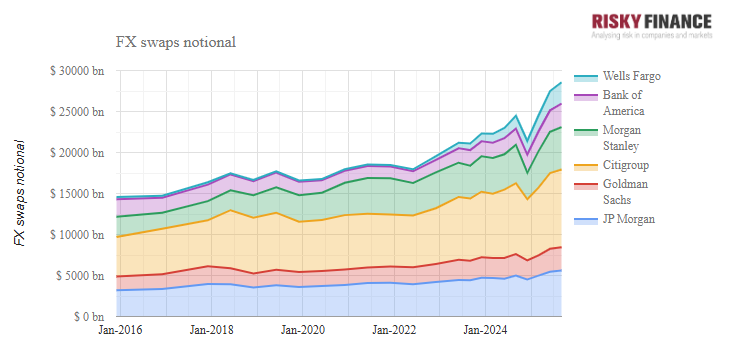 Having conceded much of cash trading to newer competitors, the banks drive to keep up using equity swaps forces them to increase exposures as market valuations reach eye-watering levels on the back of the AI boom. In the past year that has caused some firms like JP Morgan to repeatedly breach value-at-risk limits, attracting the attention of Fed regulators. However, that was not an issue during the third quarter, with none of the top six US banks reporting a VaR breach.
