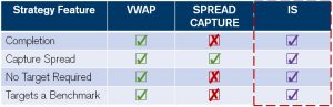 Implementation shortfall (IS) has become central to benchmarking broker execution. Historically, the tools to target IS have tried to capitalize on implicit short term bets by using price reversion or momentum models. That is to say, when traders are placing orders with IS in mind, more often than not, the tools at their disposal require the trader to decide participation bands, and then vary participation driven by price performance. If prices improve from arrival, participation increases (reversion) or alternatively decreases on the same basis (momentum). On the assumption that there is no clear alpha precipitating the trade, the net result is that while some orders may end up winning, the losing trades continue to run and as a whole produce very mixed results. That is possibly the reason why we have seen the buy-side gravitate away from traditional IS benchmark strategies into more spread capture focused strategies (see table above) for the purpose of IS benchmarking.