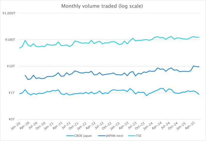 Volumes at Cboe BIDS Japan collapsed in 2024, hitting zero between 26 July and 2 September 2024. Average monthly shares traded dropped by 90% between January 2023 and January 2025, falling from 414300.5 to 9878.
