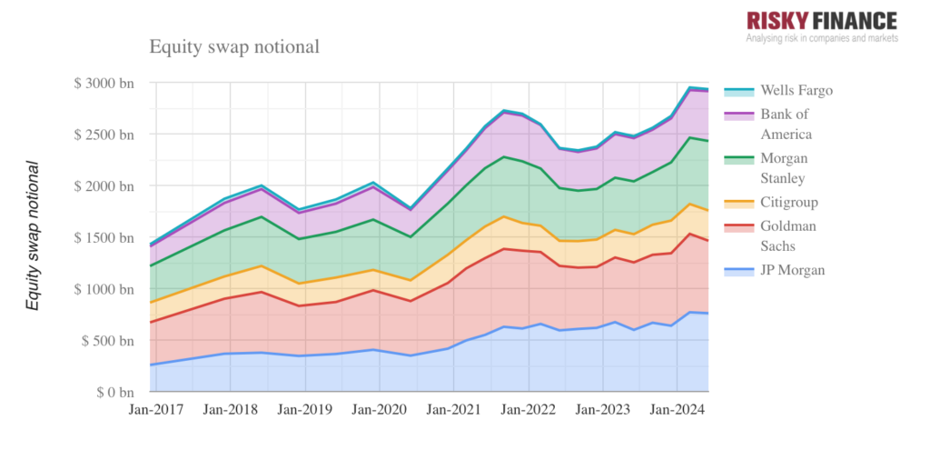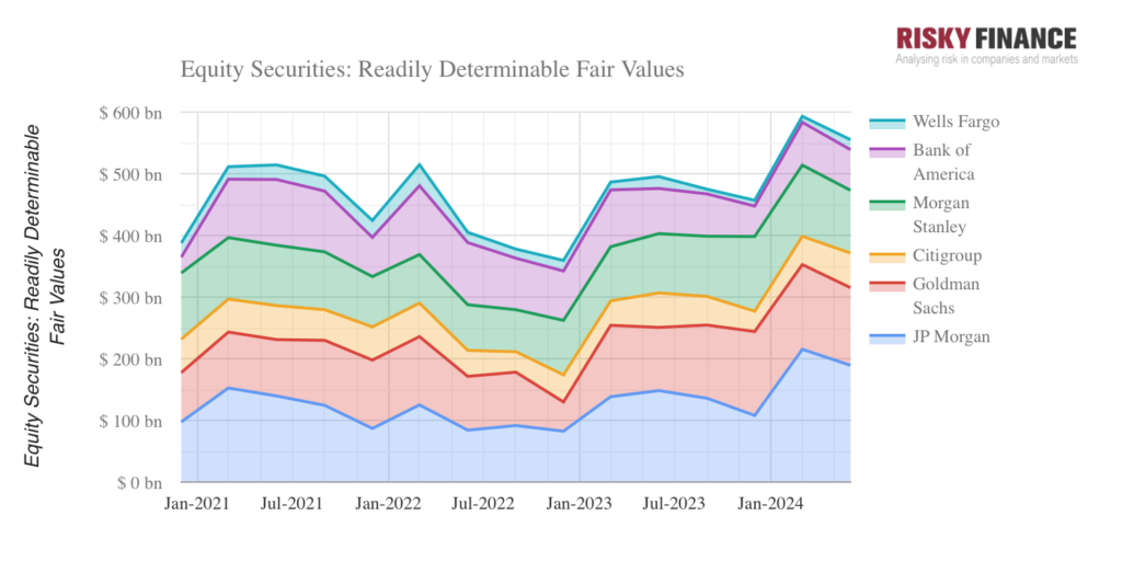 As markets have risen, so has the value of these equity exposures, reported quarterly in Fed filings. In the first quarter of 2024, equity holdings reached US$600 billion, led by JP Morgan with US$215bn and Goldman Sachs with US$137bn followed by Morgan Stanley, Bank of America, Citigroup and Wells Fargo.
