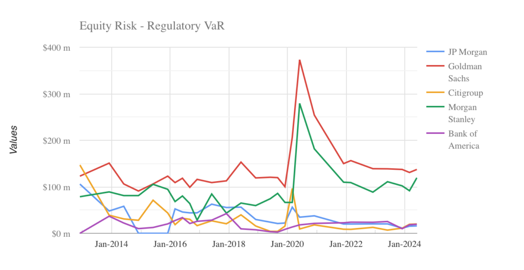 This also reflects their ability to hedge. Index hedges are most liquid, but are the least effective at hedging the risk of a stock like Nvidia. An outright short would be the best hedge for a single stock, but is either impossible e.g. for an initial public offering (IPO), or would undermine the business model of the investment banks which requires them to hold a clients’ stock with minimal market impact. Citigroup, with an equity VaR of just US$20m, is clearly not trying to play this game.